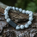 De armband is gemaakt van Jaspis kralen en heeft een luxe 'frosted' edition. Dit betekent dat de kralen niet glanzen, maar juist mat zijn en hierdoor extra elegant ogen. De combinatie van de witte stippen met de zwarte metalen schakel zorgt voor een mooi contrast.
