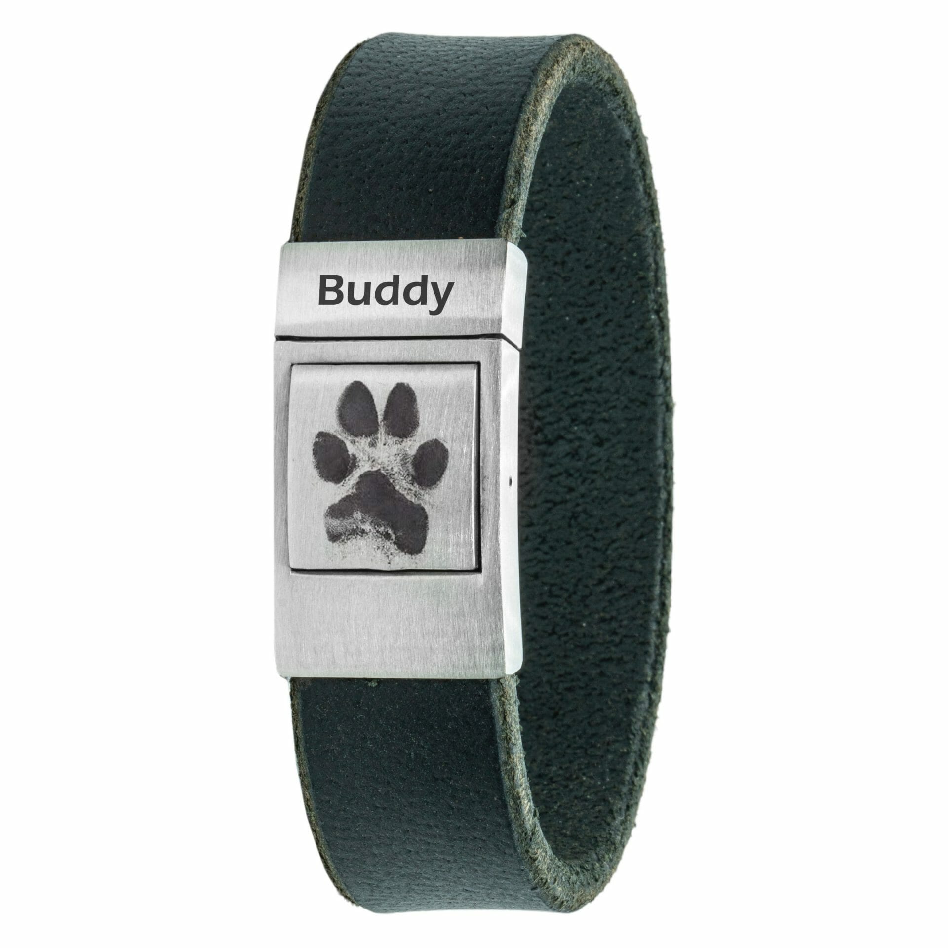 Draag de afdruk van jouw geliefde hond of kat altijd bij je met onze unieke honden pootafdruk armband. Onze armbanden zijn speciaal ontworpen om jouw gepersonaliseerde pootafdruk in stijl te presenteren op een zwarte, hoogwaardige leren armband.
