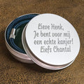 Berg je armband stijlvol op in dit persoonlijke aluminium verpakking. Dit robuuste opbergdoosje is niet alleen functioneel, maar ook nog eens een echte eyecatcher. De bovenkant van het doosje wordt gegraveerd met jouw eigen tekst, waardoor het helemaal uniek wordt!