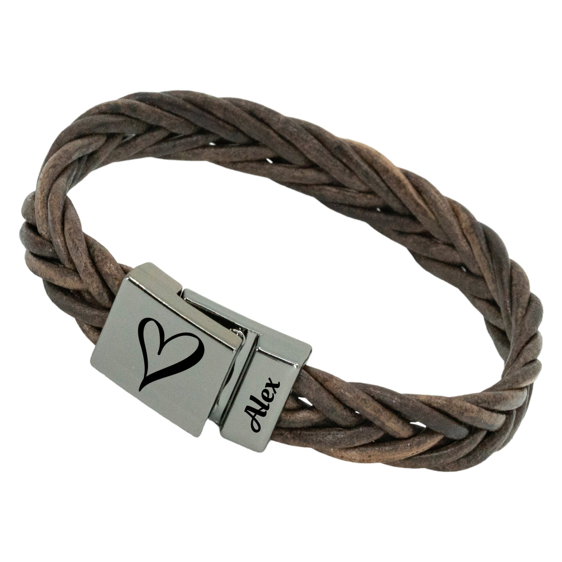 Op zoek naar een stoere en persoonlijke armband? Dan is deze gunmetal kleurige armband met gevlochten bruin leer en persoonlijke gravure echt iets voor jou! Deze armband heeft een unieke grijze donkere metallic kleur en is perfect voor mannen of vrouwen die houden van een robuuste look.