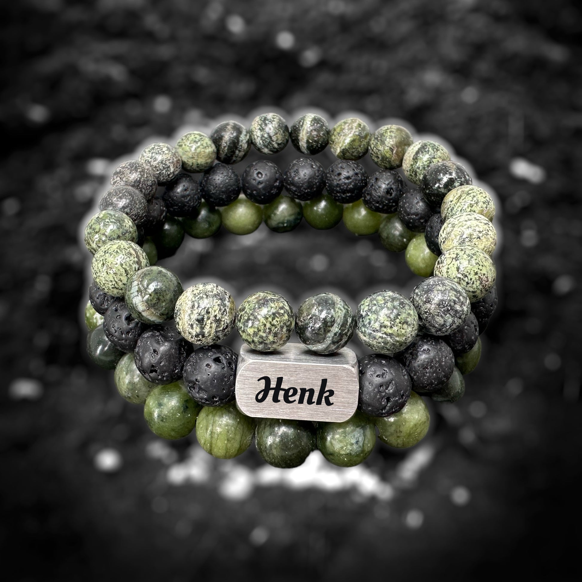 De tweede armband is gemaakt van zwarte Lava Rock, een natuurlijke vulkanische steen die kracht en stabiliteit symboliseert. Wat deze armband echt speciaal maakt, is dat je hem zelf kunt graveren met jouw eigen naam of een inspirerende boodschap. Hiermee creëer je een uniek sieraad dat echt bij jou past en een statement maakt.