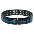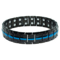 Op zoek naar een armband met een stoer design én gezondheidsvoordelen? Dan is onze Magneet Armband met blauwe elementen de perfecte keuze voor jou! Het zwarte roestvrij staal zorgt voor een robuuste uitstraling en het blauwe element over de lengte van de armband geeft net dat beetje extra stijl.