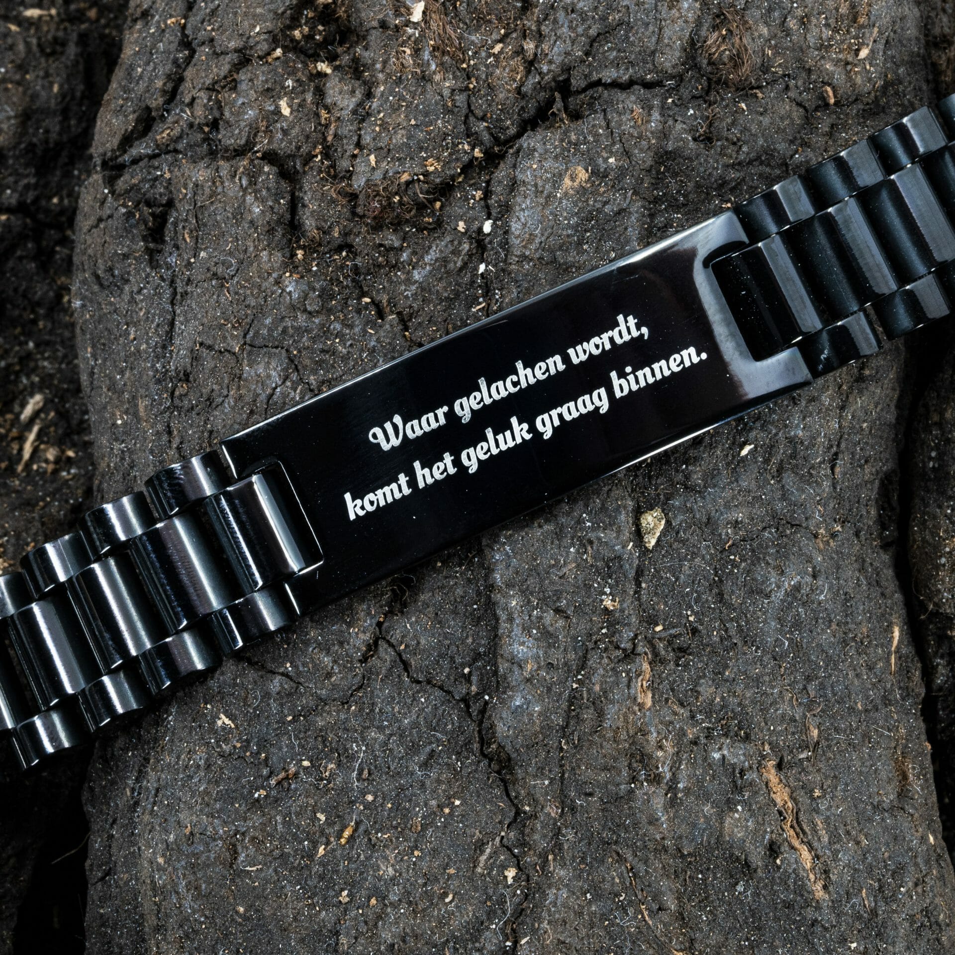 Kortom: ben je op zoek naar een uniek en persoonlijk sieraad dat net zo stijlvol als functioneel is? Dan is deze zwarte multischakel armband met eigen tekst gravure absoluut iets voor jou!