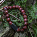 De verweerde look van de kralen geeft de armband een stoere uitstraling. De donkere tinten van baksteenrood en grijze strepen creëren een uniek patroon op elke kraal. Door de doorschijnende kwartsinsluitsels krijgt de armband nog meer diepte en karakter.