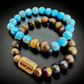 De tweede armband is gemaakt van natuurlijke Afrikaanse turquoise Jasper kralen van 8mm. Het design wordt verrijkt door twee grote tijgeroog kralen van 10mm. Deze combinatie zorgt voor een uniek en opvallend accessoire om je pols.