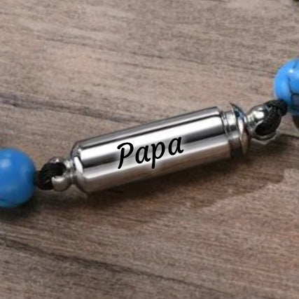 Wat deze armband echt bijzonder maakt, is de discrete as-ruimte die subtiel is verwerkt in een van de metalen schakels. Hierdoor heb je de mogelijkheid om een klein beetje as van een dierbare overledene dichtbij je te dragen, waardoor de herinnering levendig blijft.